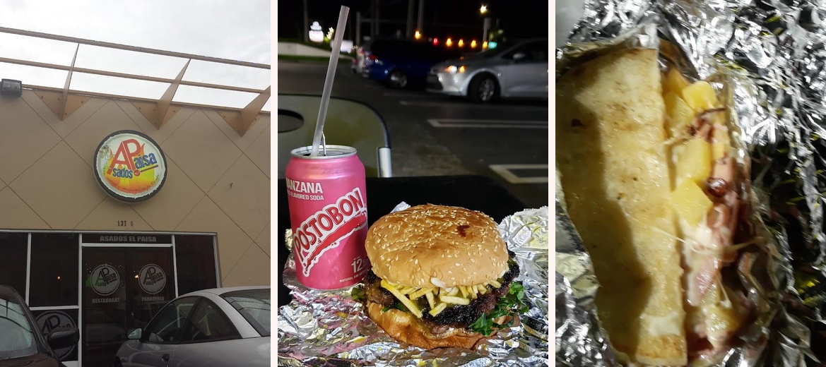 Arepa, carne de hamburguesa, bacon, tomate, lechuga, papita ripiada, queso, salsas ( rosada, ajo, perejil, pina, ketchup, mostaza)